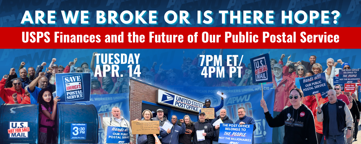 Is the USPS Broke or Is There Hope? Join the APWU Livestream on USPS Finances and the Future of Our Public Postal Service On April 14, APWU President Jonathan Smith is hosting a live stream to answer your questions about the Postal Service’s financial condition and future.